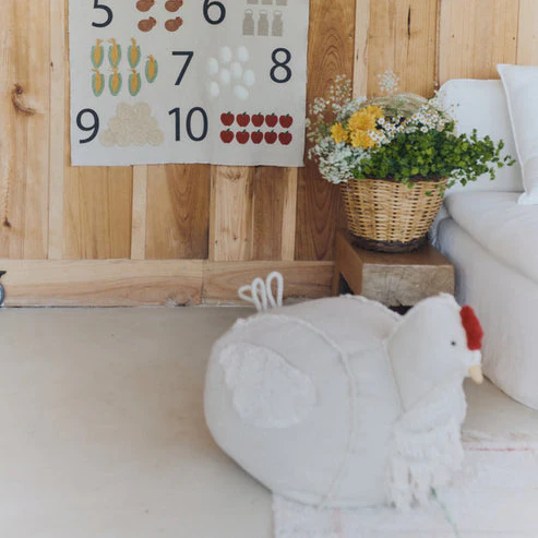 Say hi to Mamma Chicken! This chicken-shaped pouf is as playful as it is practical! Made from natural cotton canvas, it features fringes that mimic a chicken's plumage. With small pockets on the sides, it’s perfect for little ones to store their treasures. A cord tail is attached,