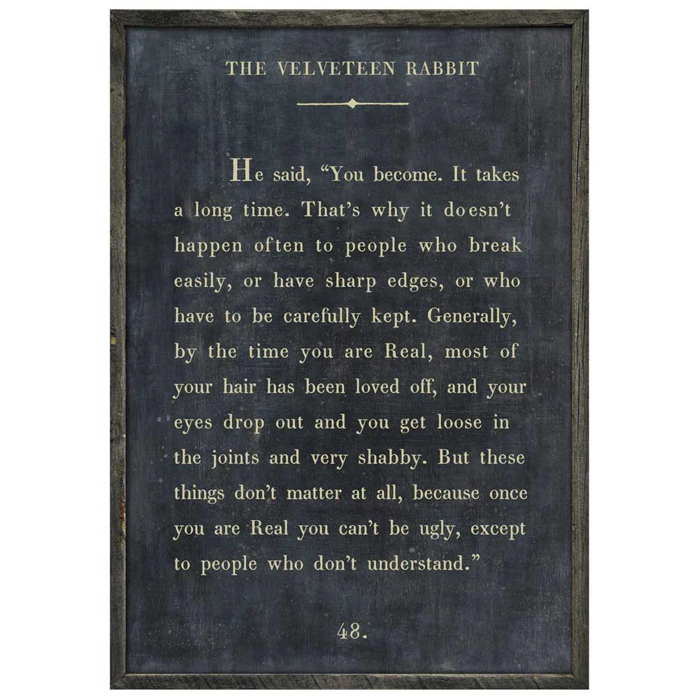The Velveteen Rabbit Framed Art Print by Sugarboo Designs showcases a memorable quote from a classic children's story. Add a heartfelt sentiment to a bedroom or living room. The artwork features a novel typeface on a neutral background for a beautiful vintage look. Available in white, cream or charcoal. Reclaimed wood frame is included. Hand-crafted and made to order. Free Shipping.